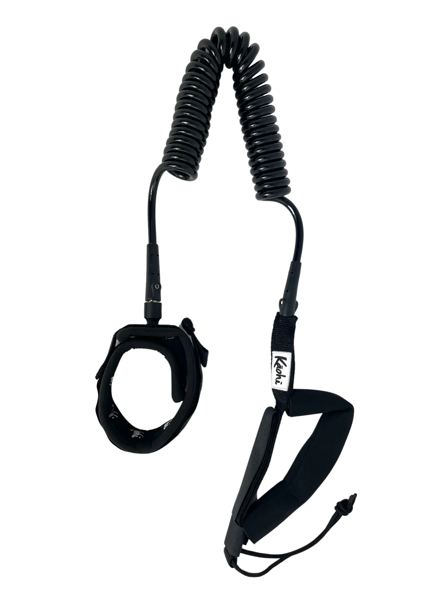 Kāohi Continuous Coil leash features Kāohi's patented GRIP:a rail-saver handle that enables you to keep your board close to you in between sets and in whitewater, and helps you to avoid others in the water and safely return to the line-up. Do not hold on to the Grip handle in the impact zone of any wave, as described in our product Notices; let your Kāohi Grip Leash™ do its job!